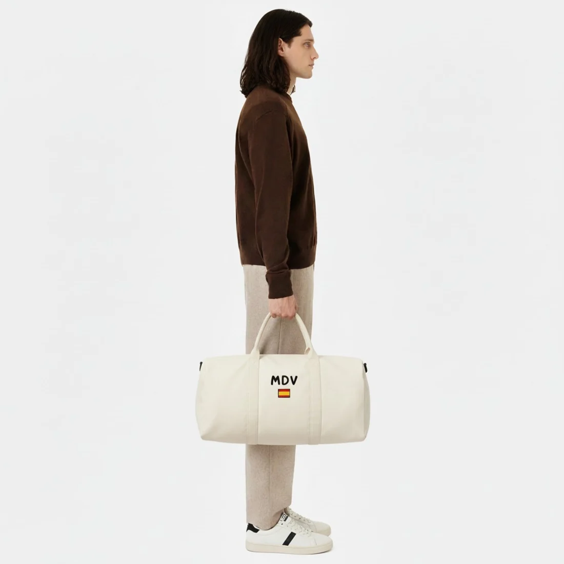 Bolsa de deporte o para viaje personalizada fabricada en tela de algodón reciclado con acabado jaspeado.