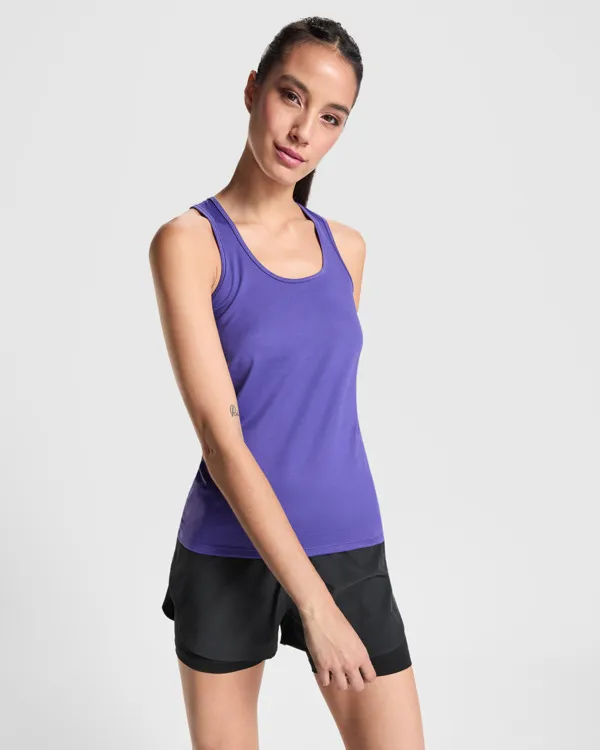 Camiseta técnica de tirantes entallada transpirable. Espalda nadadora con escote y sisas ribeteado. Tejido poliéster tacto algodón de secado fácil. Corte entallado.